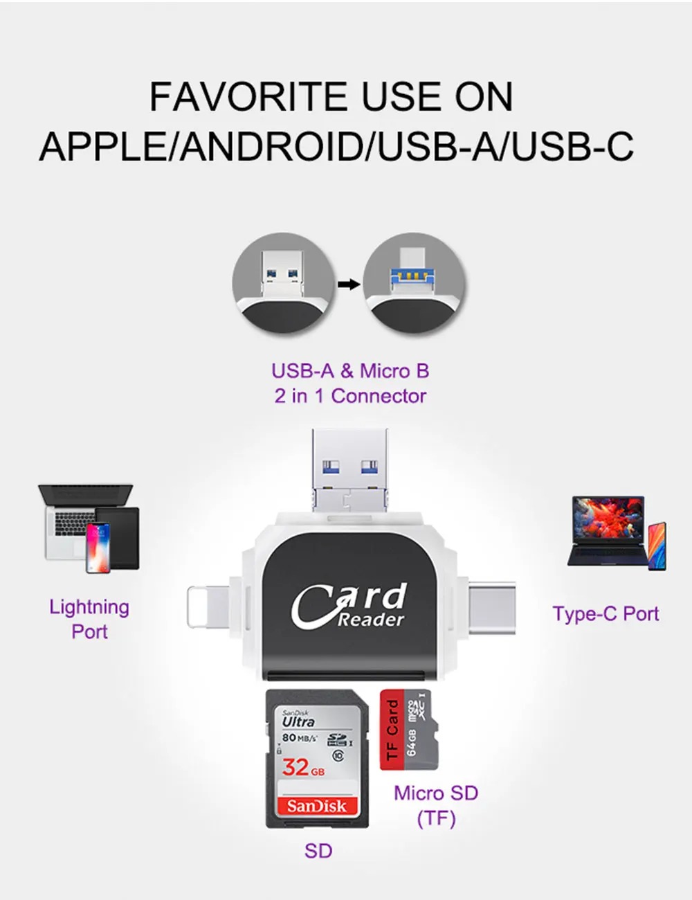 Are you looking for a way to ultimately read your SD card? Then looking for the ultimate convenience with our cutting-edge 4-in-1 SD Card Reader! Whether you’re a photographer, content creator, or simply someone who needs to transfer data quickly, this compact device is designed to grab your attention. Imagine effortlessly transferring photos, videos, and files from your camera, smartphone, or tablet. Our 4-in-1 reader supports both SD and MicroSD memory cards, making it versatile and compatible with various devices. No more fumbling with different adapters or cables—just plug and play! Picture yourself on a photo shoot, seamlessly transferring high-resolution images from your camera’s SD card to your laptop. Or maybe you’re traveling and need to back up important files from your phone. With our 4-in-1 reader, you’ll have the power to do it all. Plus, its sleek design ensures you can take it anywhere. Don’t miss out on this essential gadget. Click the link below to order your 4-in-1 SD Card Reader now and experience hassle-free data transfer like never before!