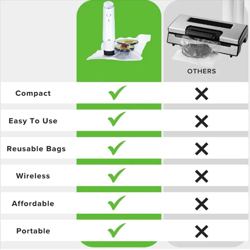❌ NO MORE HEAVY AND BULKY VACUUM SEALERS: Old-fashioned vacuum sealers take a lot of space in your kitchen, not to mention the huge single-use plastic rolls and waste. Chef Preserve hand held vacuum sealer is the size of a pepper grinder, and super easy to use.