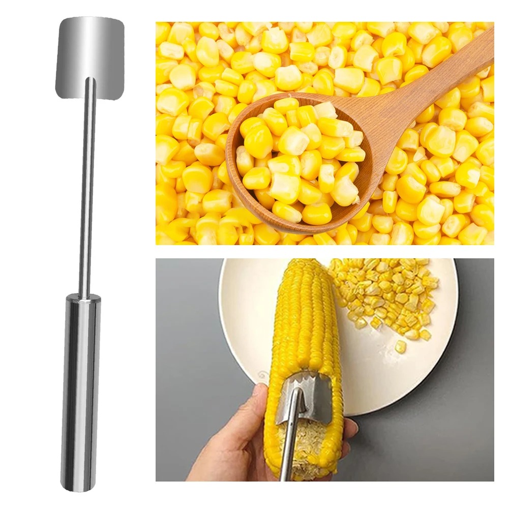 Corn Cob Peeler Stainless steel curved design conforms to the shape of the corn, making it easier to strip. The cob corn stripper tool is aligned with the core of the corn,remove corn from the cob in one quick pushing motion by hand.