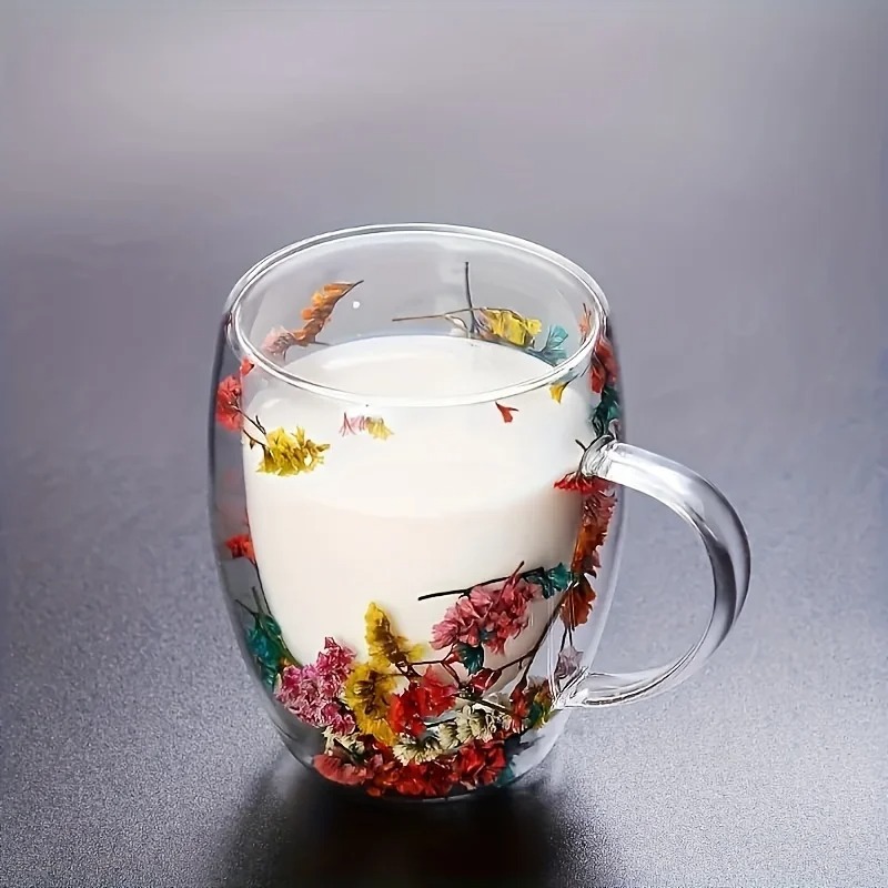 Exquisite Flower Glass Cups: This double-wall glass cup is adorned with dried flowers, making it aesthetically pleasing and suitable for enjoying coffee and tea