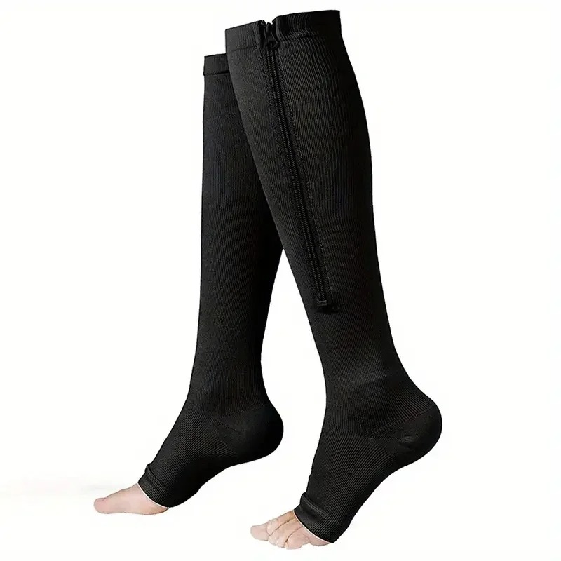 FEATURES: Compression sleeves for legs Fits comfortably around calves Zipper closure Breathable material Open toe design Reduces swelling Designed to improve circulation and elasticity which helps burn fat Helps to prevent varicose veins Can be worn alone or underneath clothing
