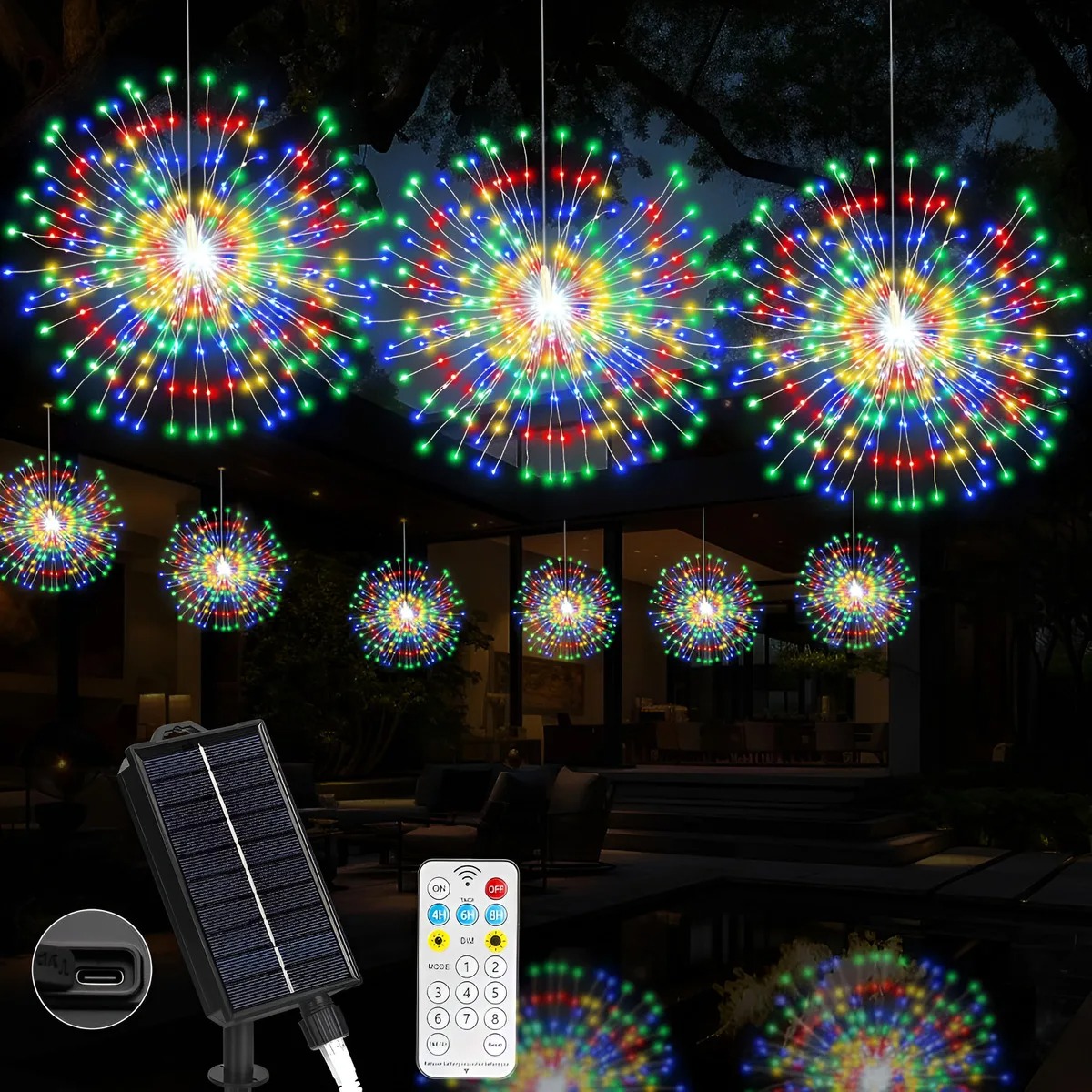 【IP65 Waterproof & Durable】The hanging solar firework light is IP65 waterproof, and does not need to worry about wet weather or short circuit damage. String lights use insulated copper wire and low-calorie bulbs, and the bulb does not heat up after long-term use. The solar panels can be inserted into the ground or glued to the wall or other objects.