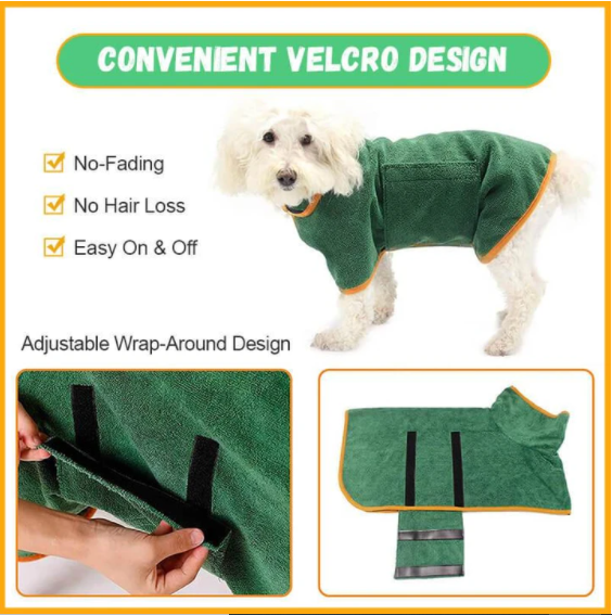 The Super Absorbent Pet Bathrobe has super absorbency and can be used as a towel to dry your pet’s fur or as a bathrobe/coat/nightshirt for warmth and comfort.